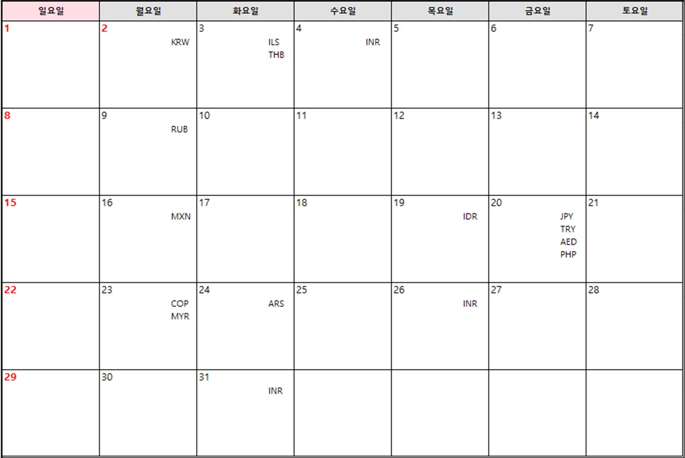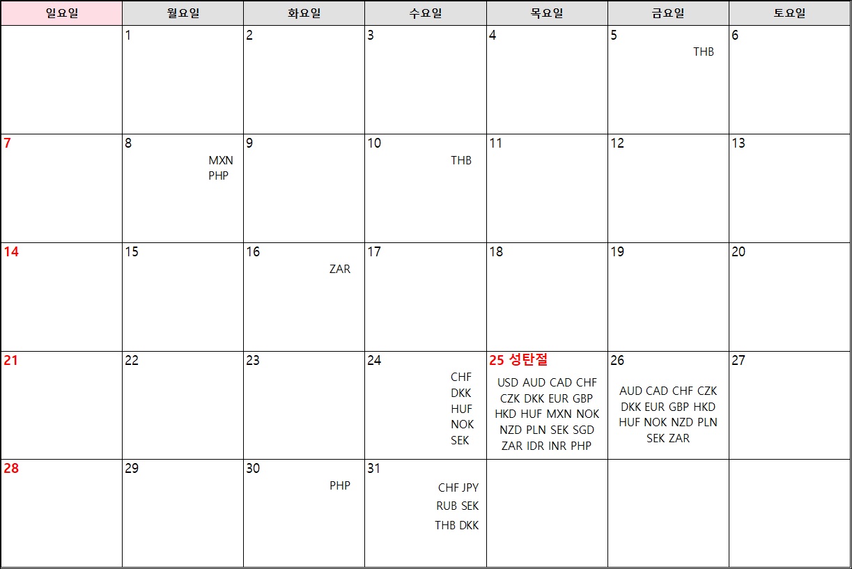 통화별 은행 휴일 안내 입니다.